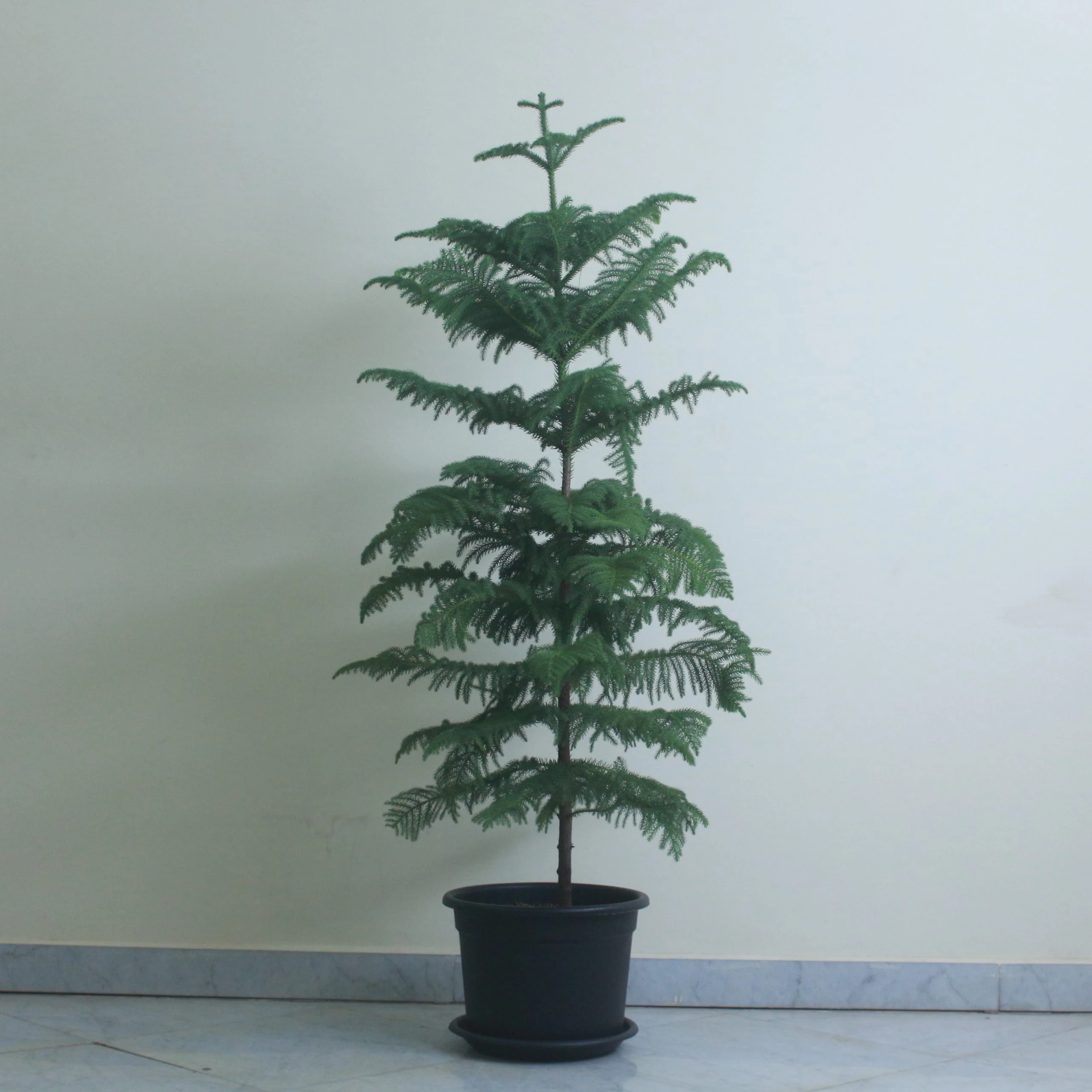 The Norfolk Island Pine is a cone-bearing evergreen tree known for its tall, upright, and elegant form. It features whorled branches with dark green, fan-like, needle-type foliage. The short, leathery, linear needles are densely arranged in flexible, caterpillar-like clusters along the lateral branches, giving the tree its distinctive and graceful appearance.